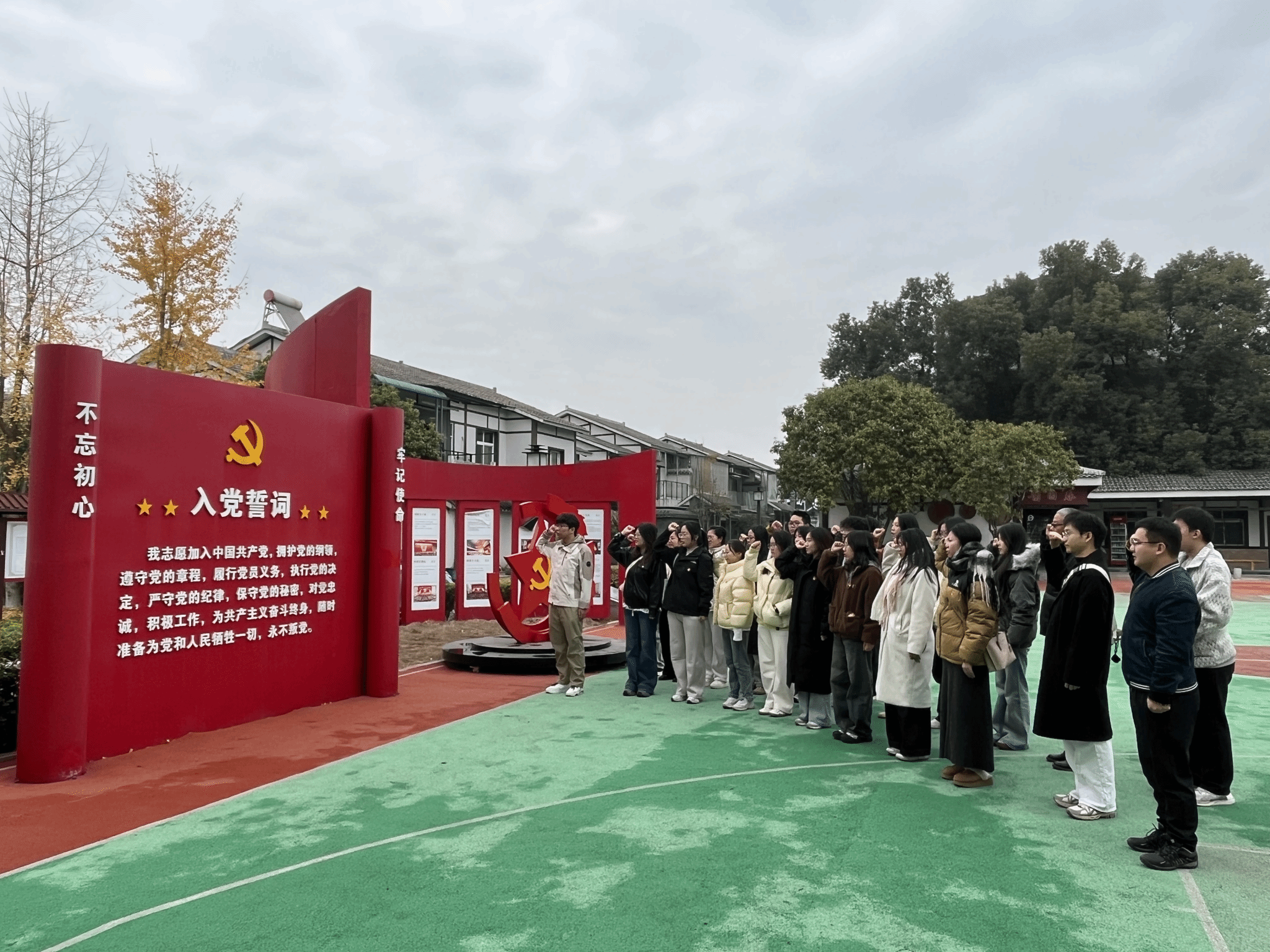 在峒山教育基地,同学们来到了峒山社区总体发展规划沙盘前。沙盘详细展示了峒山社区的整体布局、产业发展、基础设施建设等情况。大家认真听取了工作人员的讲解,了解峒山社区的规划和发展历程,并重温习近平总书记视察峒山时的重要指示精神,通过丰富的历史图片与详实介绍,深刻体悟国家改革发展的宏伟蓝图与基层实践的紧密联系。在庄严的党旗下,全体师生党员重温入党誓词,铿锵誓言回荡,初心使命铭记。