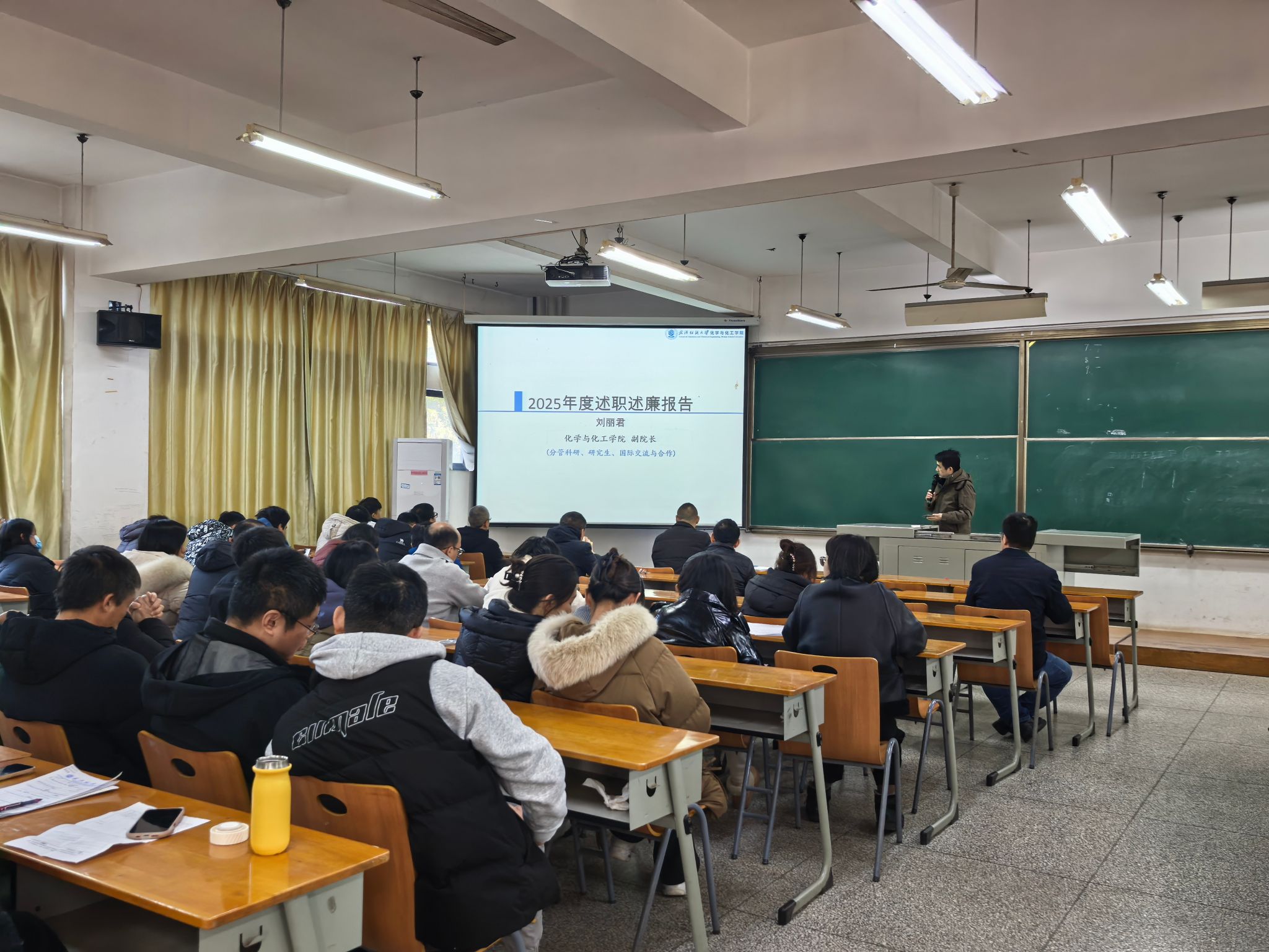 2026年1月6日下午,化工学院2025年领导班子和干部述职考核测评会在崇礼楼221教室顺利召开。学院全体领导班子成员、教职工参会,学校考核组由图书馆党总支书记曾荣带队,何志俊、毕慧婷两位老师一同出席测评会。会议由曾荣主持,核心目的在于全面、客观、精准评价领导班子及干部年度履职成效,进一步强化干部责任担当意识,为推动学院各项事业高质量发展凝聚奋进力量。