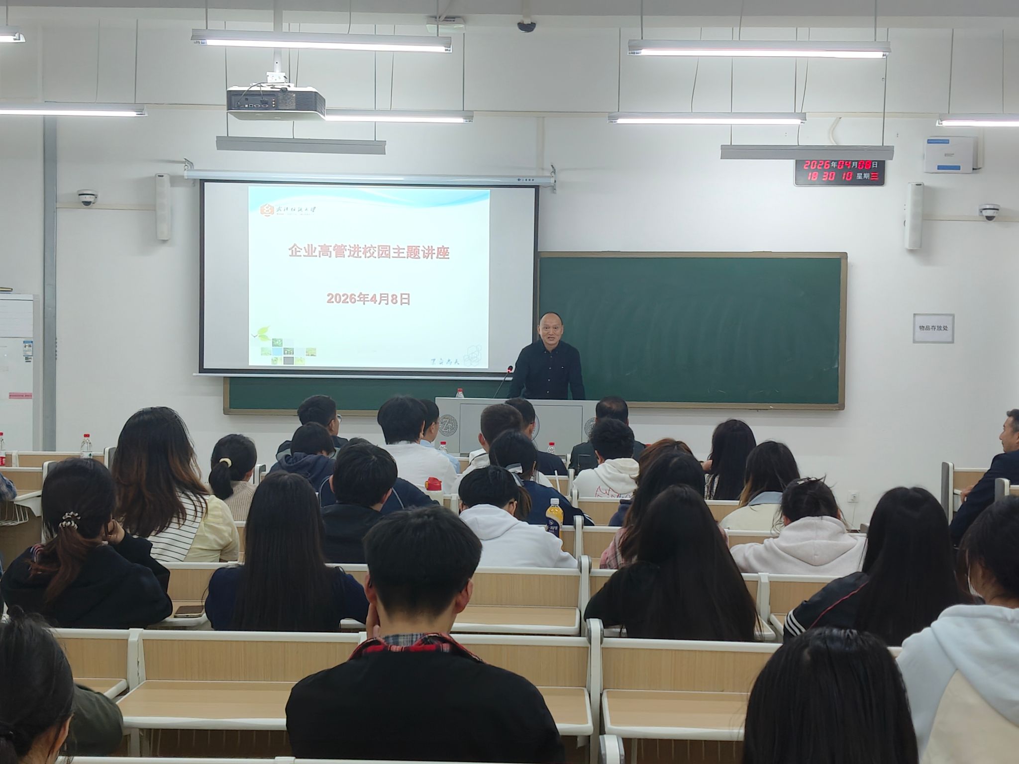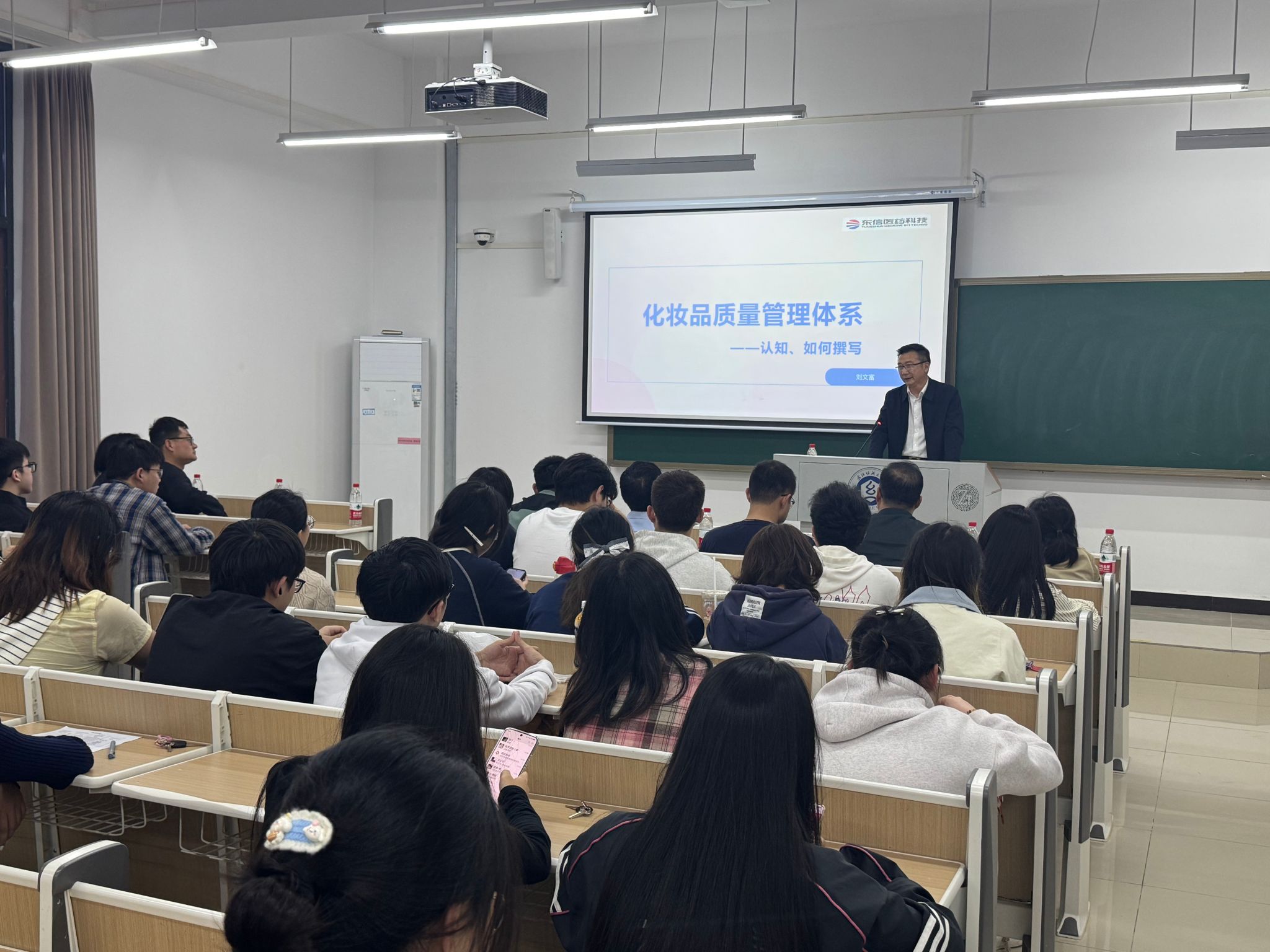 讲座环节,刘文富书记以“化妆品质量管理体系——认知、如何撰写”为主题,结合近三十年行业深耕经验,系统解读了化妆品质量管理体系的核心内涵与关键要素,精准剖析《化妆品监督管理条例》等相关行业法规,详细梳理产品注册备案全流程,并重点分享了体系文件撰写、安评报告编制、生产工艺规程编写等实用实操技巧。他结合企业研发、质量管理、公职监管等多场景真实案例,拆解专业实操难点,将抽象的专业知识转化为通俗易懂的实践指引,整场讲座深入浅出、干货满满,赢得在场师生阵阵热烈掌声。