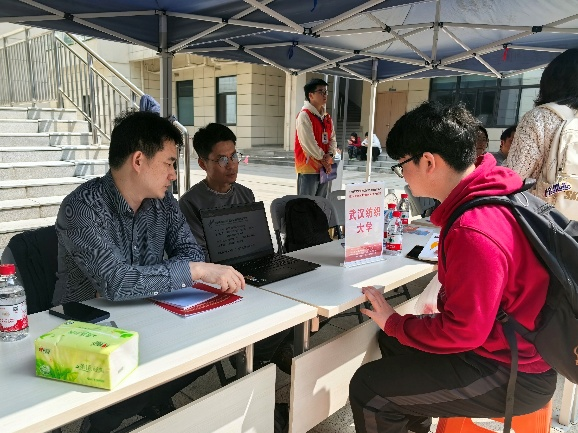 在武汉纺织大学咨询点,两位老师围绕学校招生计划、专业特色、初试科目、导师研究方向及奖助体系等内容,为考生逐一细致解答、耐心指导。此次参加安徽研招专场咨询活动,是学院主动“走出去”服务考生、吸引优质生源的具体举措。通过面对面交流,有效打通考研信息壁垒,进一步提升了学校在外省高校的知名度与影响力,为学院研究生招生工作夯实了基础。