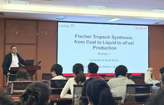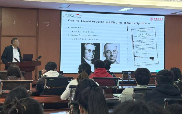 刘歆颖教授从南非的煤制液产业现状切入,提出了将氢能作为新能源载体的发展思路,并展望了南非未来的氢能发展路线图。同时,他介绍了自己负责的怀柔实验室煤合成油团队,该团队致力于煤炭高效低碳利用研究,旨在推动煤炭由燃料向原料转型,并开发高附加值化学品。报告结束后,刘歆颖教授与在场师生进行了互动交流,对大家提出的问题作了详尽解答,现场学术氛围浓厚。