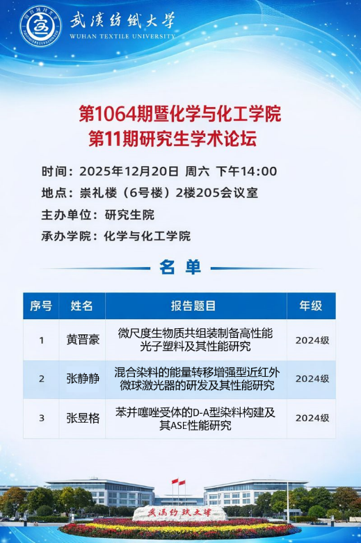 12月20日下午,武汉纺织大学校第1064期研究生学术论坛暨化学与化工学院第11期研究生学术论坛在崇礼楼(6号楼)2楼205会议室举行。本次论坛由研究生院主办、化学与化工学院承办,吸引了学院师生积极参与。