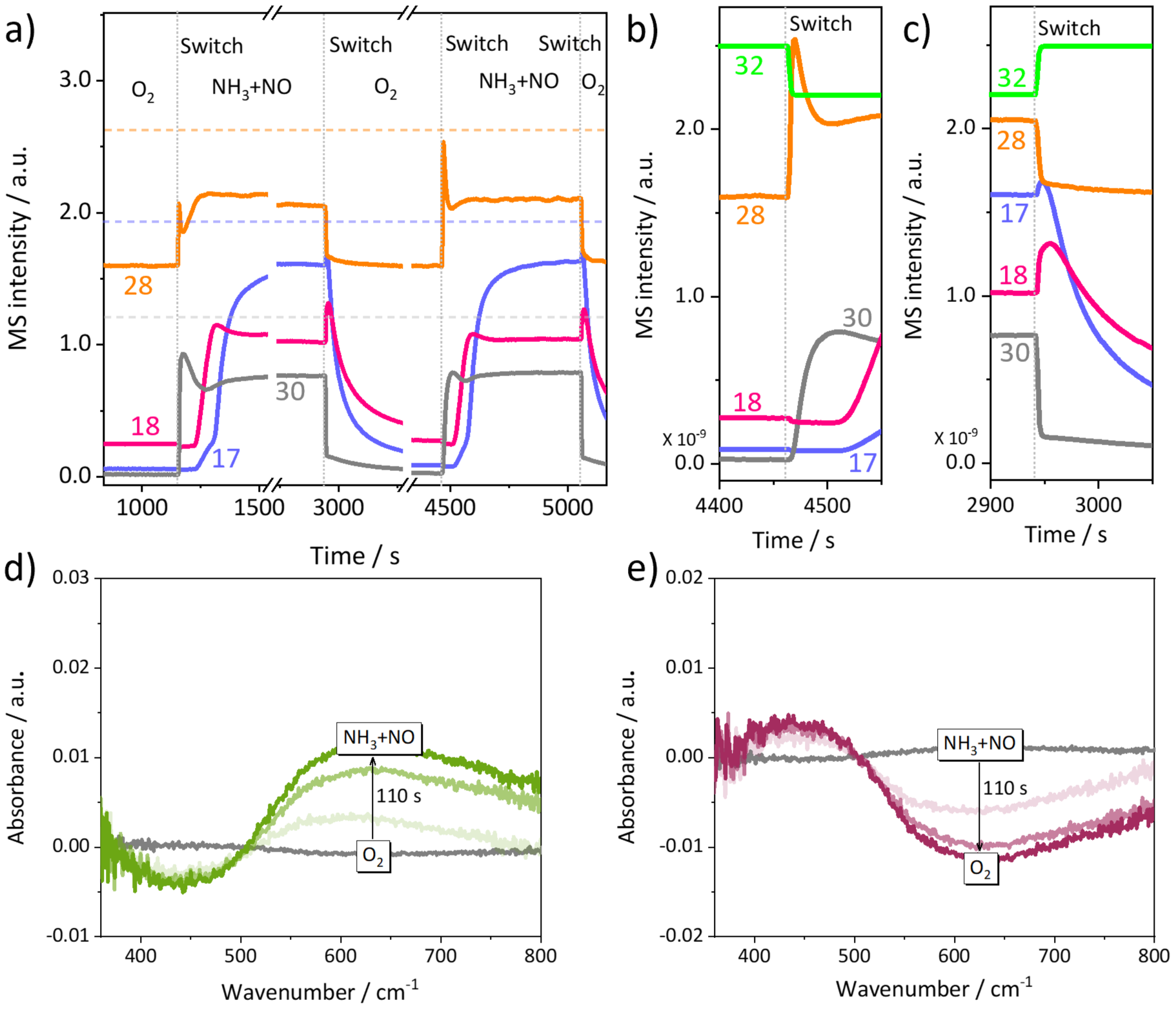 operando DR-vis结果显示(图1),NH3 + NO条件下,Ce4+被还原为Ce3+,引入O2后,Ce3+迅速被氧化为Ce4+,形成可逆的Ce3+/Ce4+循环。虽然在无O2条件下, NH3与NO仍可发生反应生成N2,但由于Ce3+无法被氧化,反应速率迅速衰减,说明催化循环受到限制。在O2与NH3 + NO交替切换过程中,观察到显著的N2“喷发”现象(N2 eruption)。该现象源于初始阶段表面Ce4+含量较高,反应短时间内不受Ce3+再氧化限制,因而表现出较高的反应速率。这一关键证据表明,限制反应持续进行的并非NO与NH3的反应步骤,而是Ce3+向Ce4+的再氧化过程。
